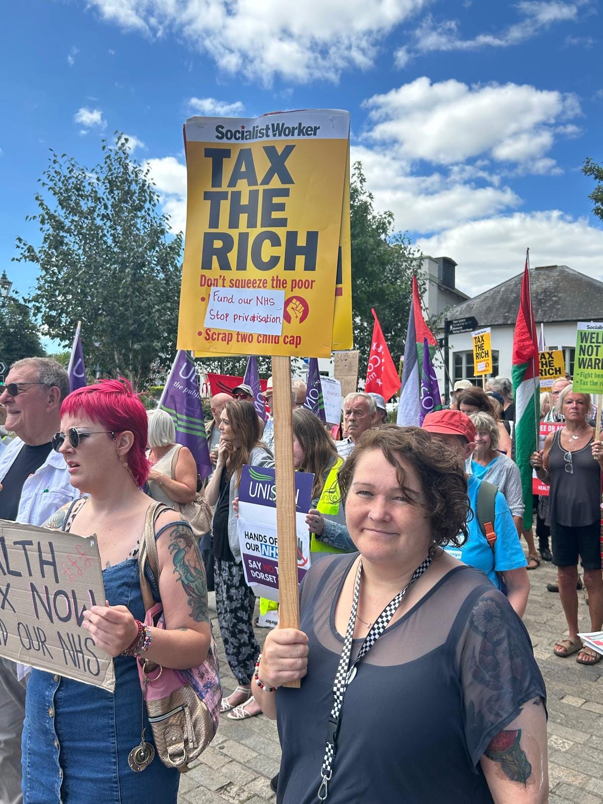 Saturday, August 2nd, saw a powerful show of solidarity outside Dorset County Hospital, as support staff, NHS workers, trade unionists, and members of the public gathered to protest against plans to move over 1,700 NHS workers into a private “subco” company.